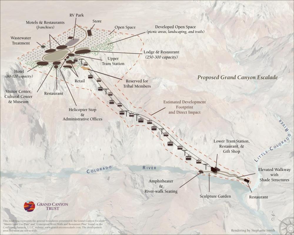The developer's proposed mega-resort and gondola tramway would be located on 420 acres of Navajo land (about 60 miles by car from Cameron, Arizona), at and above the confluence of the Colorado and Little Colorado rivers.